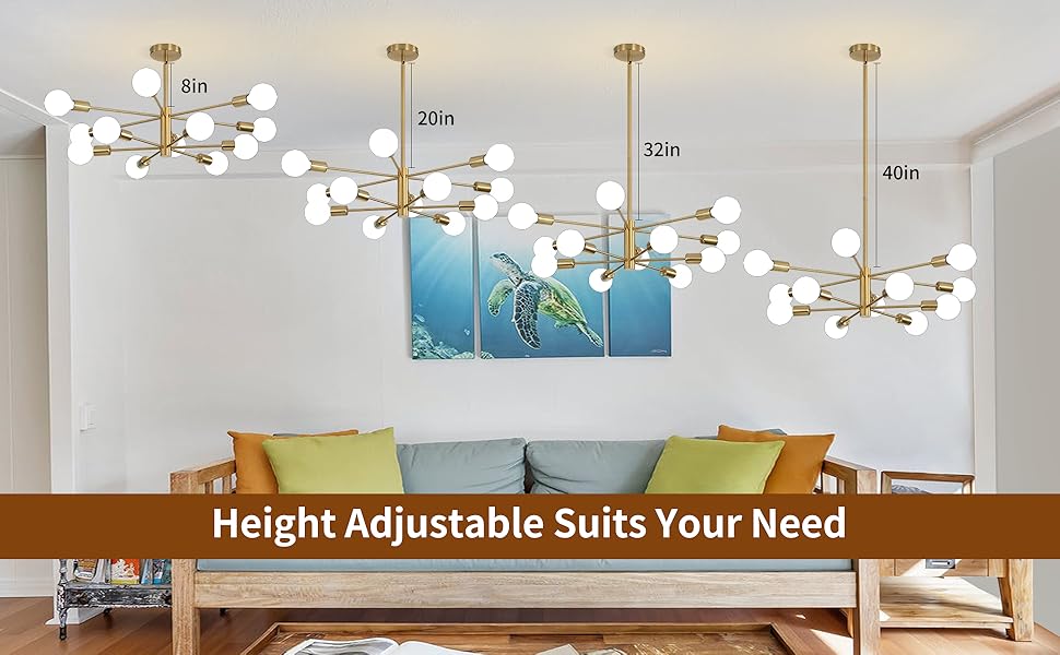 Height Adjustable: Designed with spatial versatility and individual needs in mind, this kitchen chandeliers over table comes with 6 extension rods (including 4*8″+2*4″ rods). The total hanging height is 40 inches, which can be adjusted to suit your specific installation needs
