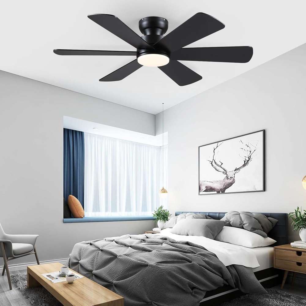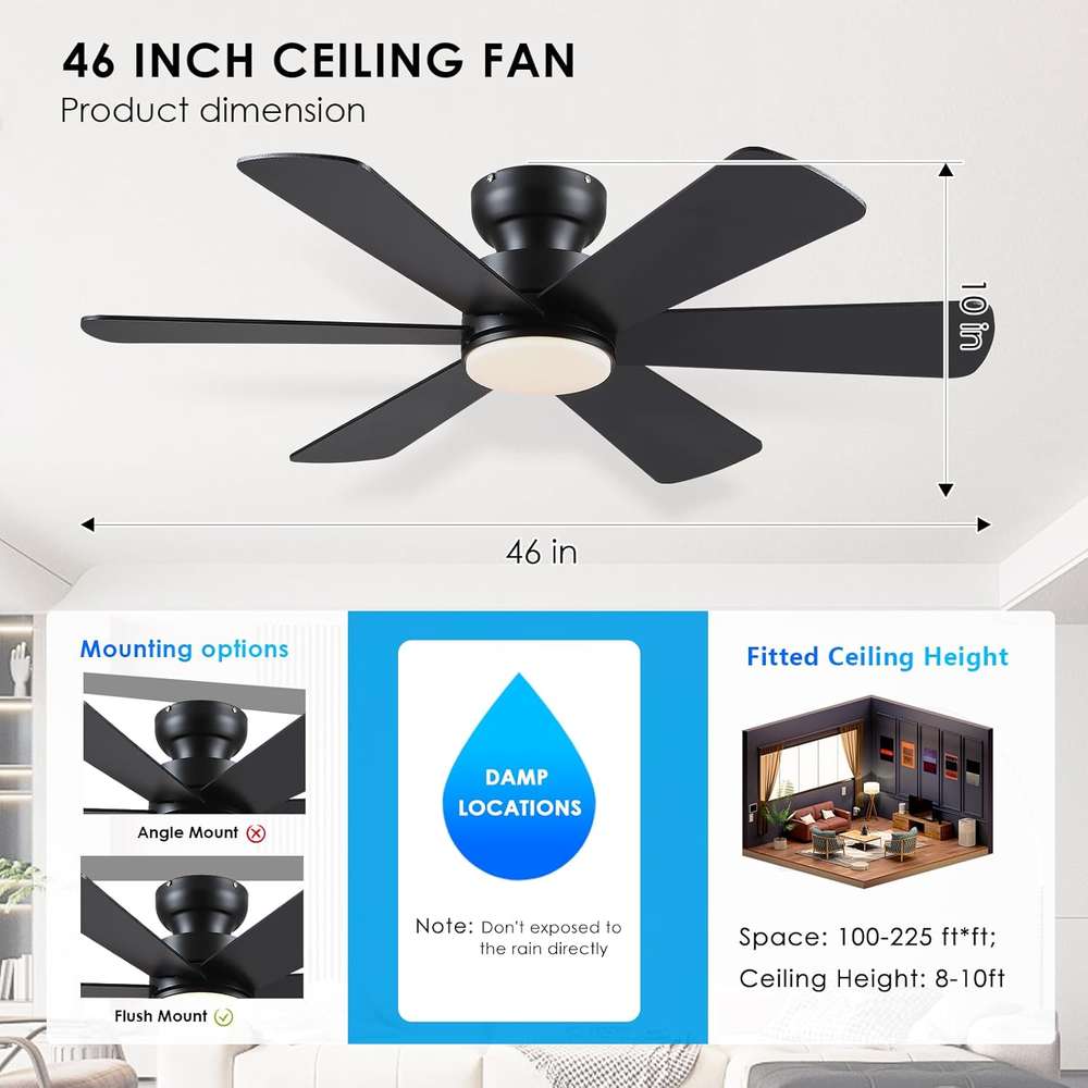 Ultra Softer Wind Ceiling Fan with Light Modern/Rustic: This 46inch led black ceiling fans features 6 fan blades with DC motor, provide super softer airflow and bright light for 100-225ft flat flush mount space. Wooden fan dual-sided available blades and metal motor shell, offering both sleek fabulous appeal fitted in modern/contemporary/farmhouse/traditional styles and durable benefits. Ceiling fans with lights and remote APP control, light and fan can be controlled separately or jointly