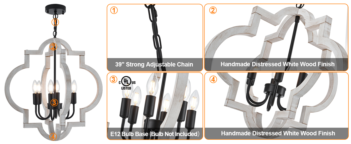 【Bulb Requirement & Dimmable】 The farmhouse pendant light is compatible with LED bulbs, incandescent, CFL, Edison bulbs, halogen bulbs, etc. 6 x E12 base bulbs, MAX 60W (Bulbs are not included). It is fully dimmable with a compatible dimmer switch to create the perfect lighting effect (Bulbs and dimmer switch both are not included).