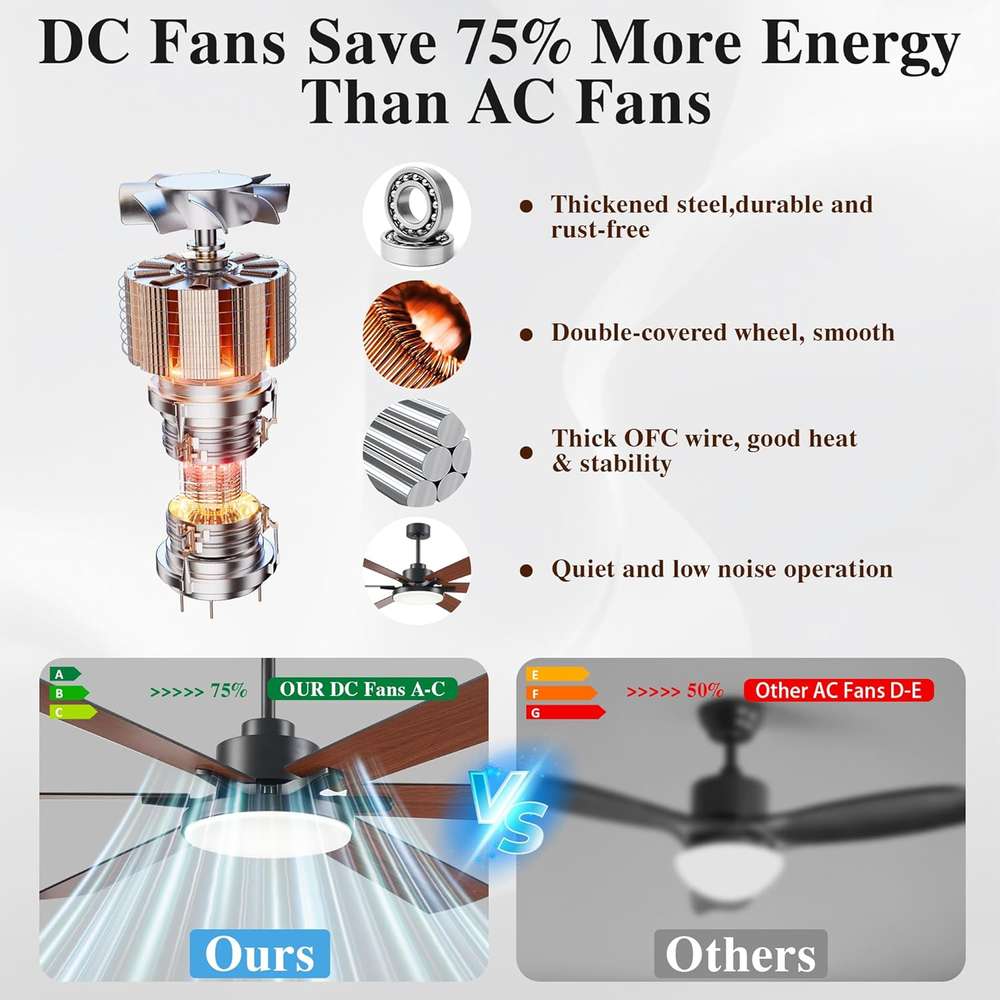 Quiet & Efficient DC Motor:Indulge in uninterrupted calm with our big assed industrial ceiling fan’s nearly silent DC motor, engineered to operate at a mere 30 dB—a gentle hum softer than a butterfly’s wingbeat. Perfect for households with light sleepers, seniors, or little ones, it ensures peaceful environments without compromising on performance.Powered by a high-efficiency DC motor, this fan delivers 65% less energy consumption than traditional AC motors,The outdoor ceiling fans Ideal for patios