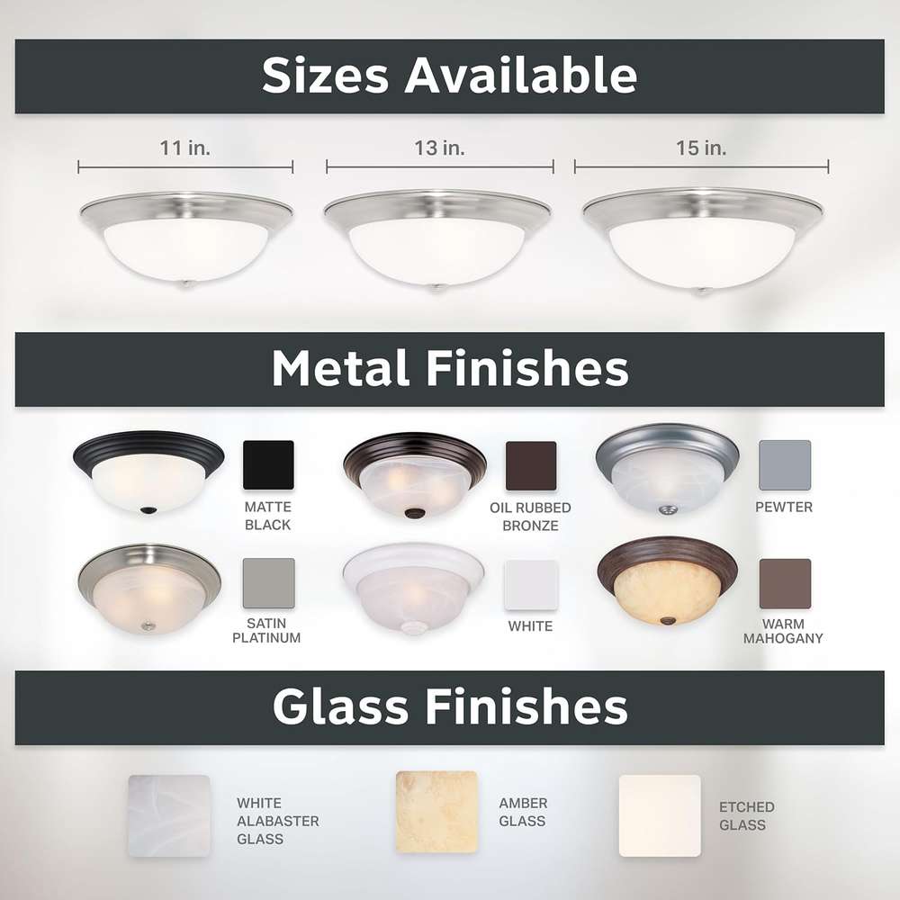 SPECS: Our ceiling light fixtures measure 13.25 W x 13.25 D x 5.25 H in inches, and are suitable for use with two medium base 60W LED or incandescent bulbs (Bulbs not included); flush mount ceiling lights are cULus certified for use in damp indoor areas and backed by a 1 year warranty