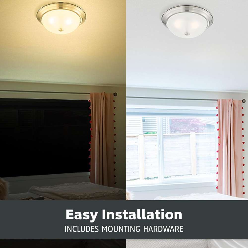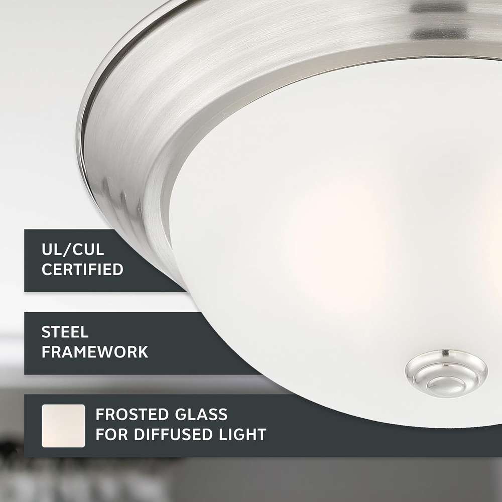 Add bright interior illumination and a touch of elegance to your home with our DESIGNERS FOUNTAIN ceiling mounted light fixture. Constructed with durable long-lasting steel and sleek etched glass, this ceiling mounted light fixture cover is great for adding a touch of class and sophistication to your home decor, and is perfect for use in bathrooms, bedrooms, stairwells, hall ways, utility rooms, or even the entrance to your home. This interior light fixture includes the necessary mounting hardware to allow for easy installation onto ceilings, and the flushed ceiling light also allows for easy bulb replacement. Our simple light fixture measures 13.25 W x 13.25 D x 5.25 H in inches, and is suitable for use with two 60W LED or incandescent bulbs (Bulbs not included). This round ceiling light is cULus certified for use in damp indoor areas, and backed by a 1 year warranty. Enhance your home’s lighting with this elegant and contemporary light fixture.
