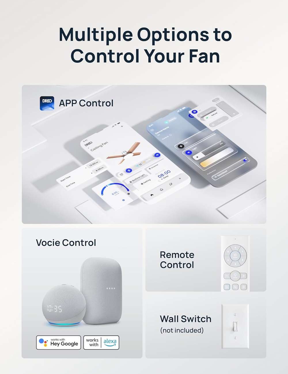 Smart Ceiling Fan Experience: The DREO app, along with Amazon and Google Home voice command compatibility, allow convenient control of your ceiling fan. It enables setting schedules, adjusting lighting, fan settings, timers, and more.