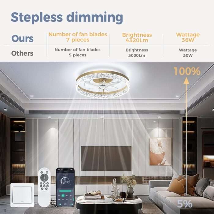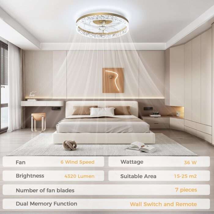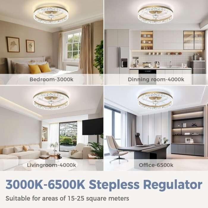 Easy Installation & Specification Information:7 Blades, 595-1030 RPM Speed, 3420 LM Brightness, 37 W Power. The size of 20 inches in diameter and 6.9 inches in height makes the flush mount ceiling fan more suitable for rooms of 15-25 square meters, such as bedroom, kitchen, dining room, bathroom, kids’ room, living room and office. The ceiling fan with light feature simplified installation, and most components are pre-assembled, reducing the need for complicated assembly