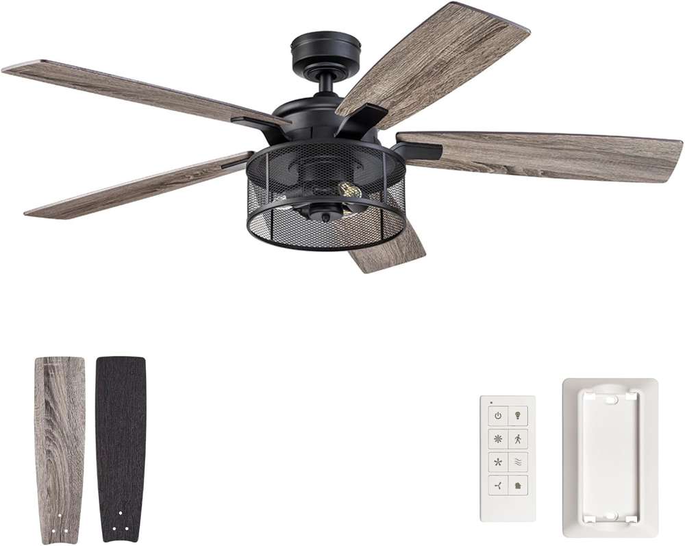 Honeywell Ceiling Fans Carnegie, 52 Inch Industrial LED Ceiling Fan with Light and Remote Control, Dual Mounting Options, Dual Finish Blades, Reversible Motor – 51928-01 – (Matte Black)