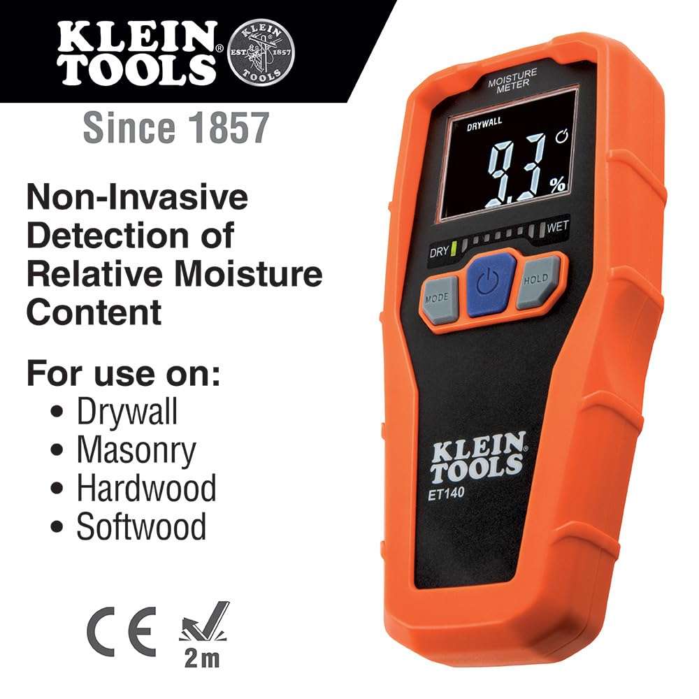 Klein Tools ET140 Pinless Moisture Meter for Non-Destructive Moisture Detection in Drywall, Wood, and Masonry; Detects up to 3/4-Inch Below Surface