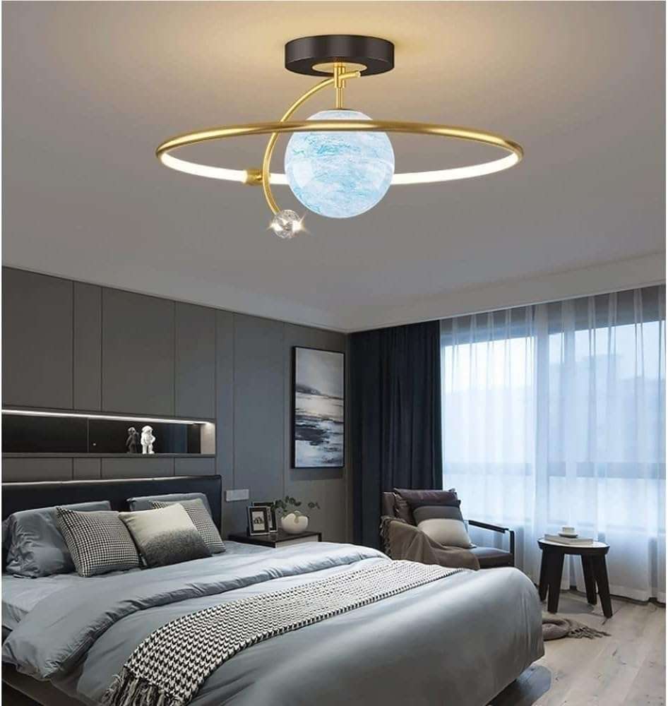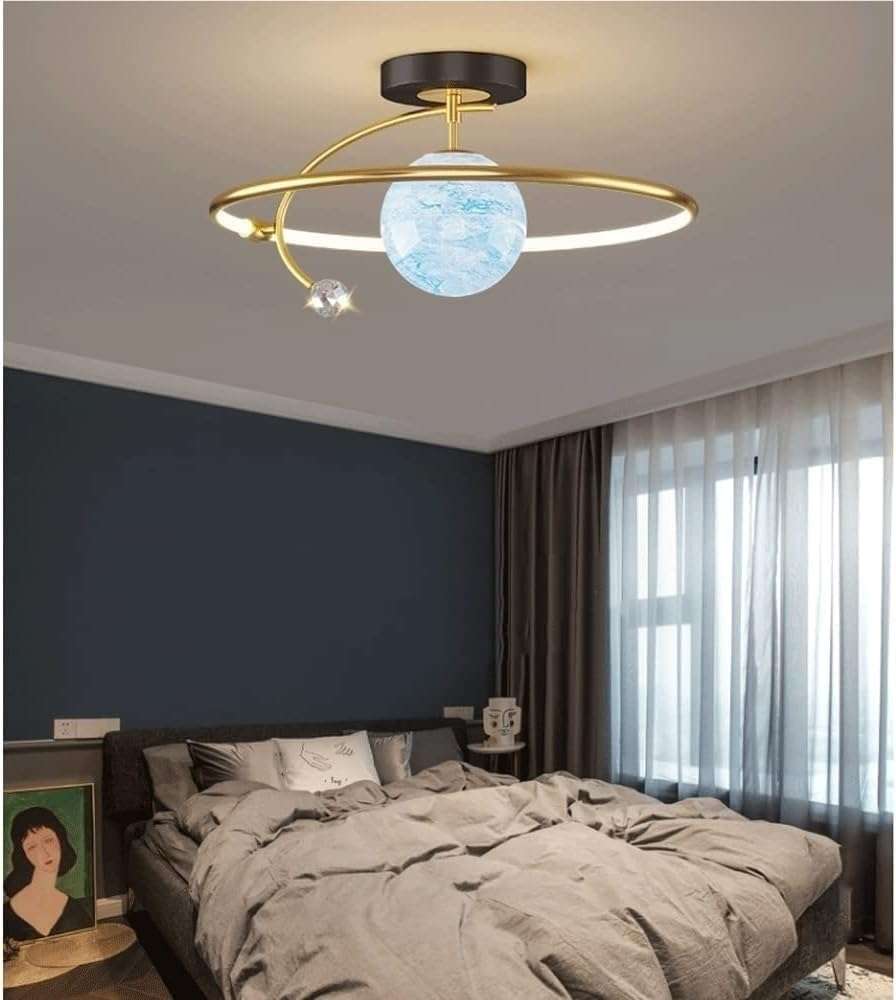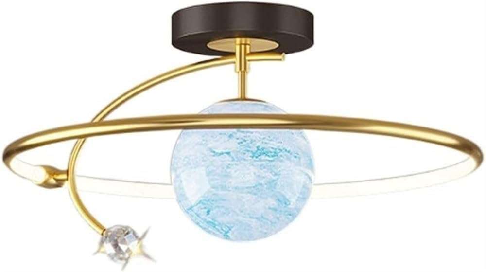 Modern Planet Glass Ceiling Light: Inspired by planetary design, this ceiling light features a moon-shaped glass globe and a black gold ring, adding a playful yet modern touch to rooms and bedrooms.