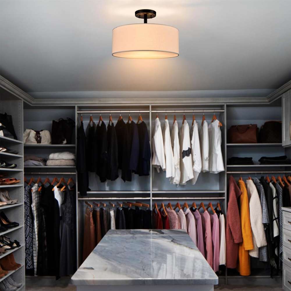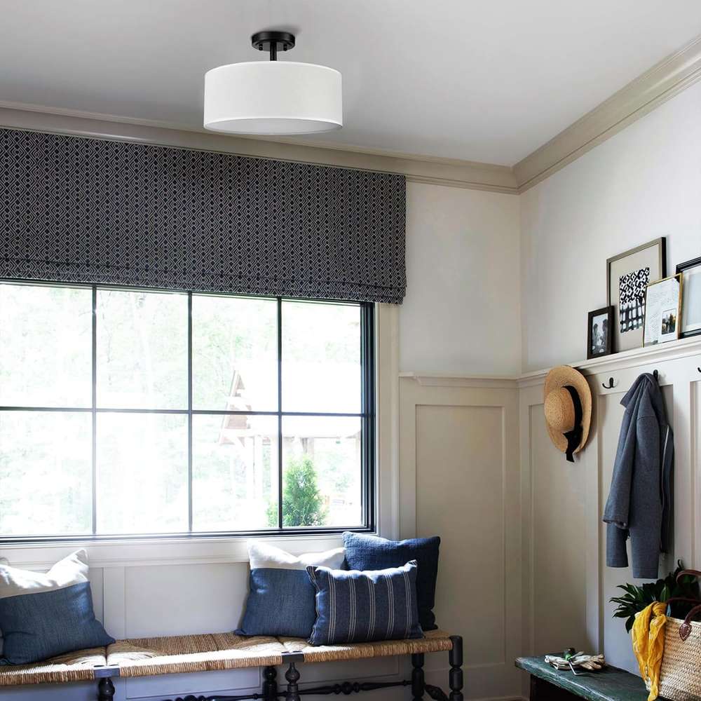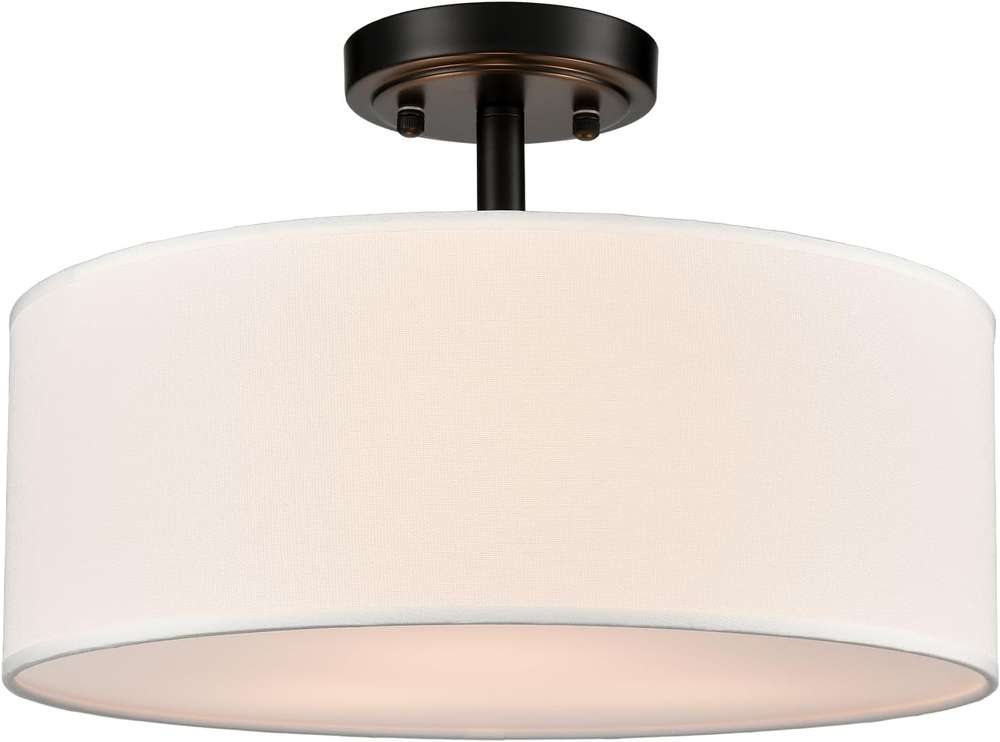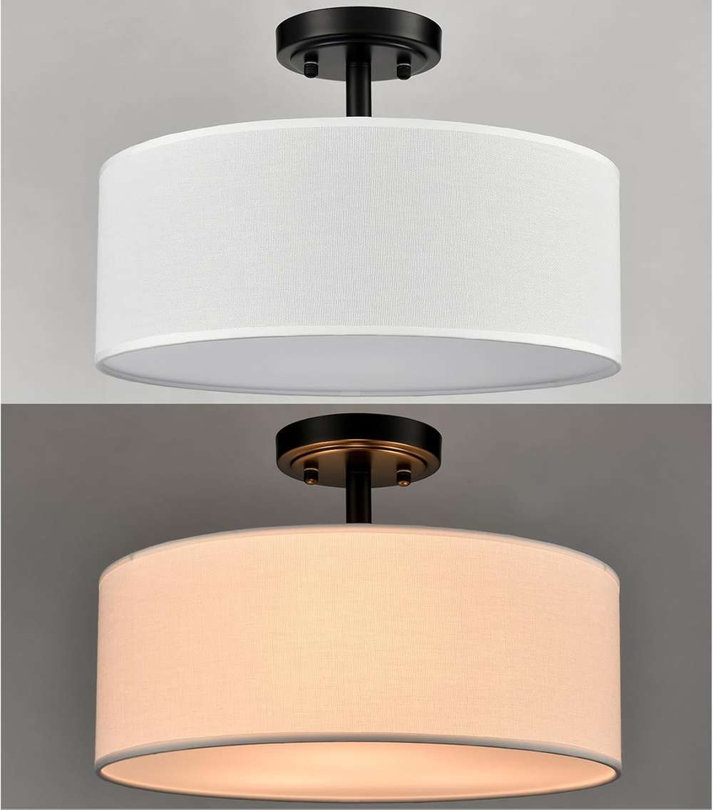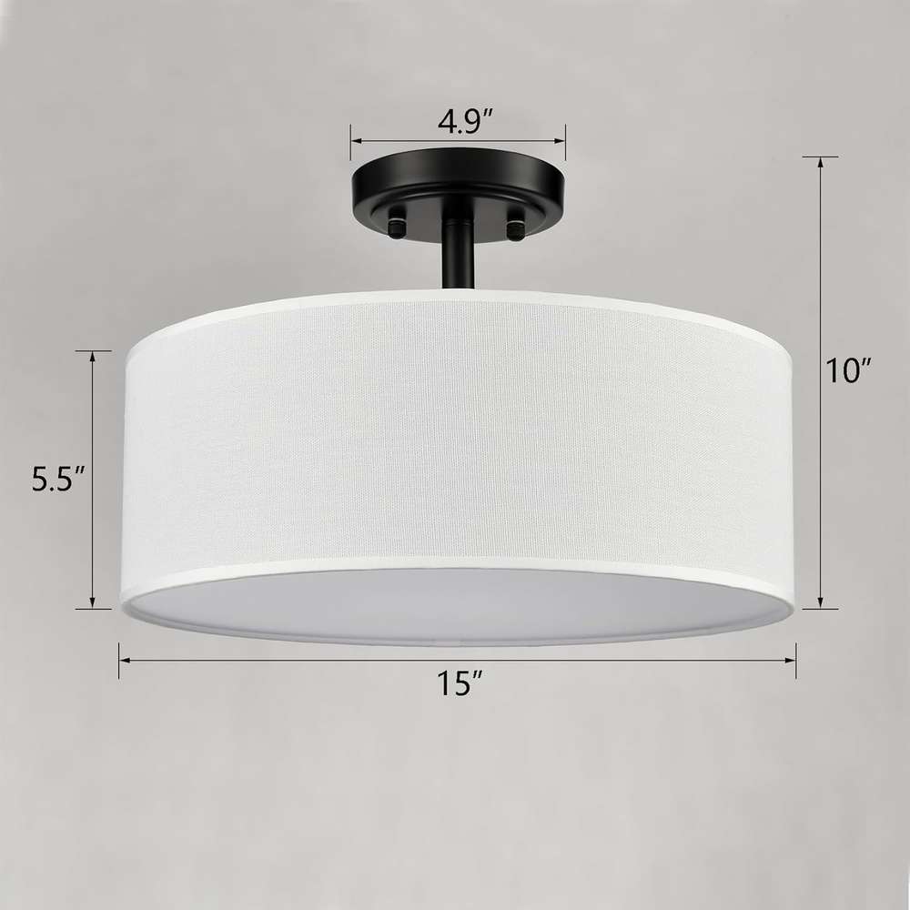 The semi flush mount ceiling light marries a sleek metal frame with drum-shaped linen shade to complement home decors from contemporary minimalist to art deco.