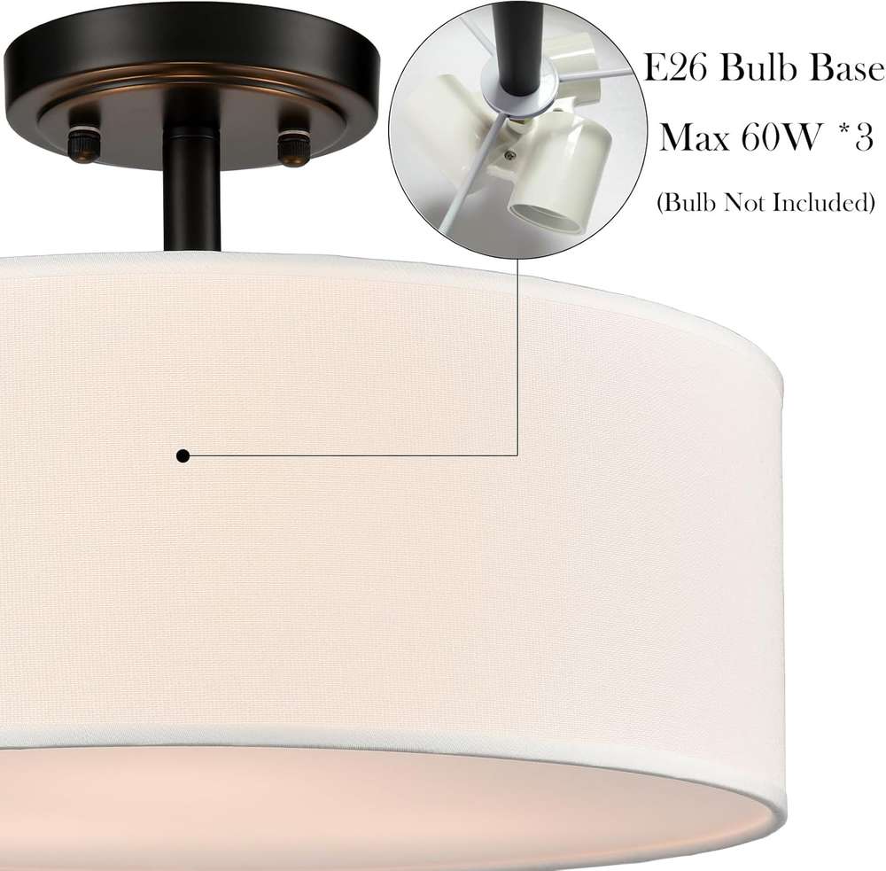 Standard E26 Socket: the semi flush drum light fixture requires three E26 based bulb (NOT Included), max 60W each bulb, supports any CFL, LED, or incandescent light bulb. Fully dimmable with using dimmable bulb and dimmer switch (NOT Included).